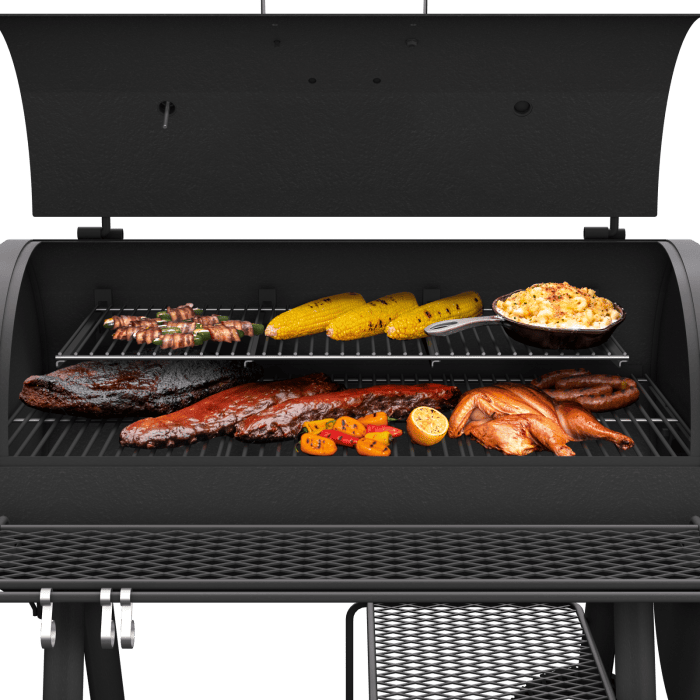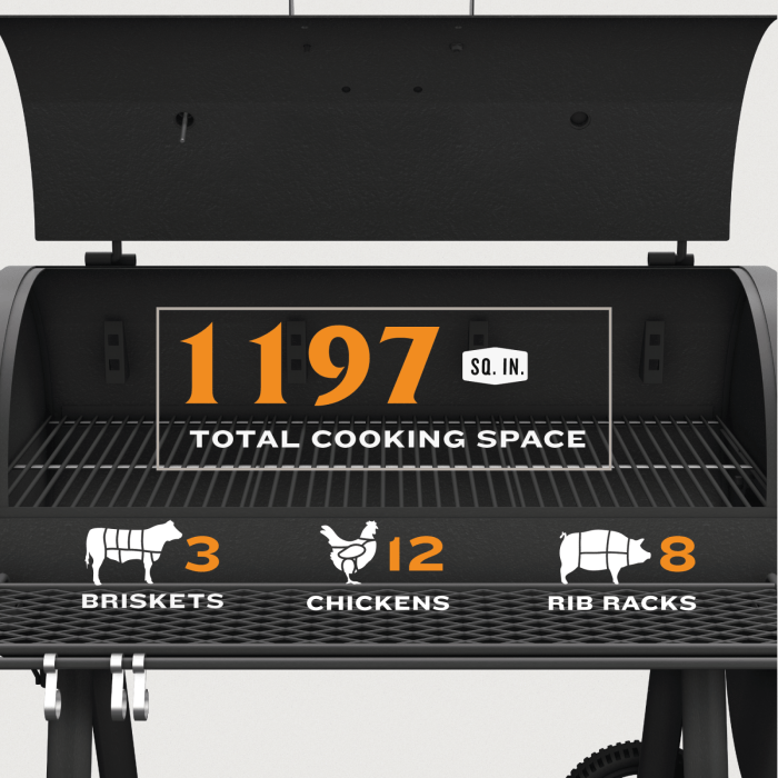 COOKING AREA: Smoke up to 5 briskets, 10 whole chickens or 7 pork shoulders on the 619-square-inch primary and 328-square-inch upper cooking grates. Grill up to 15 wings or 6 burgers on the 281-square-inch firebox grate.